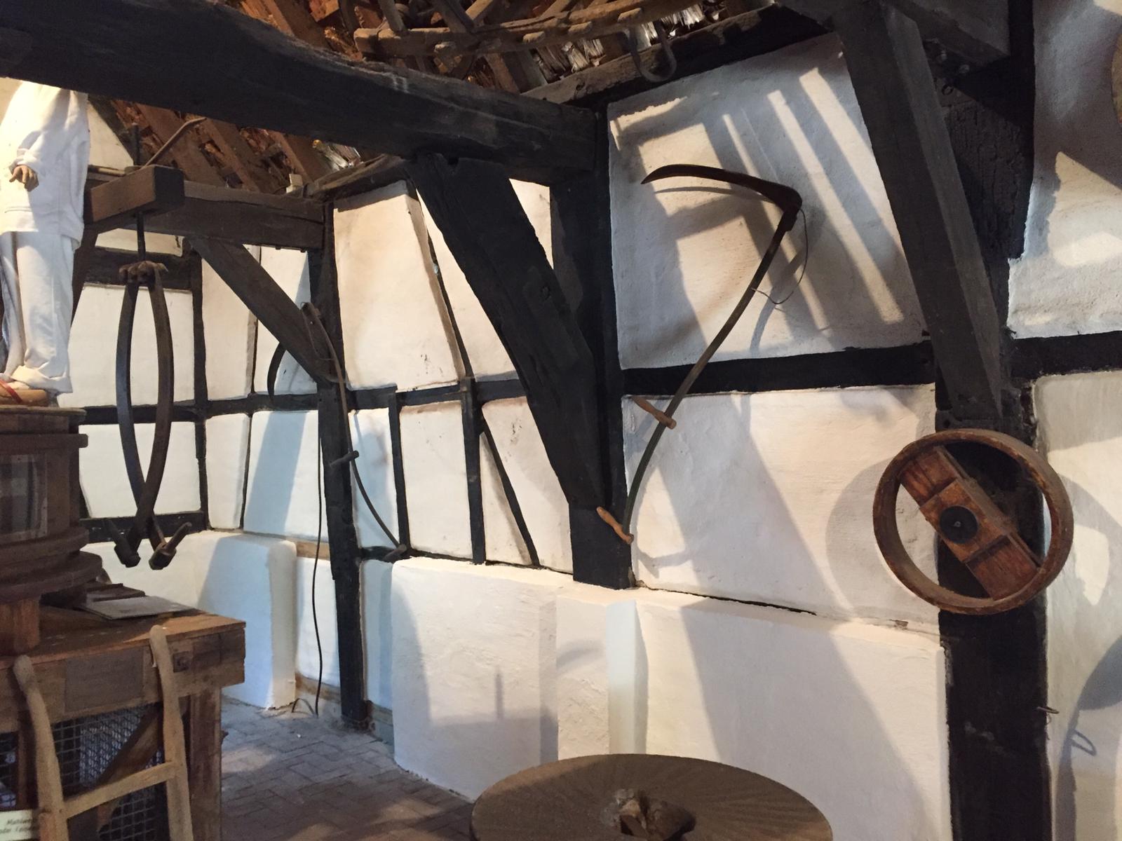 der Sommerbilder ein Blick in das Innere des Fachwerkhauses. Auch hier ist alles gereinigt und bereit für neue und alte Besucher. Als der letzte Müller Altebockwinkel 1924 den Betrieb einstellen musste, da hatte seine Familie die "Spanische Grippe" (weltweit 50 Millionen Tote) überlebt, doch Wind- und Wasserkraft waren der Dampf- und Elektrokraft unterlegen. Die Grippe-Pandemie bekam den Namen "Spanisch.." weil eine spanische Zeitung zuerst darüber berichtete. In den meisten Ländern gab es im 1. Weltkrieg Zeitungszenzur. Der Virus soll zuerst in einem Hühnerbetrieb in Kansas (USA) aufgetreten sein.